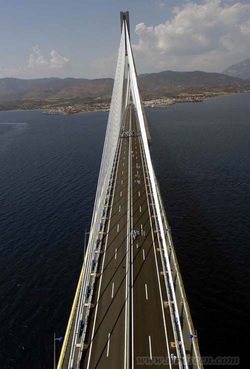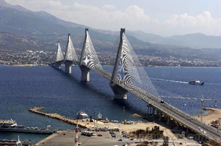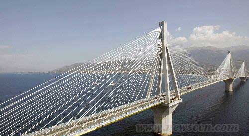 數(shù)千年的地殼運(yùn)動造成了希臘的伯羅奔尼薩半島和大陸的分離,而今年8月建成的、橫跨科林斯海灣里永-安蒂里永大橋?qū)⒈蛔匀唤绶蛛x了幾千年的這兩塊陸地連接在了一起。它不僅僅是世界上最長的斜拉橋—橋面直接用懸索吊在龍門架上,而且還是世界上技術(shù)最先進(jìn)的橋梁之一。