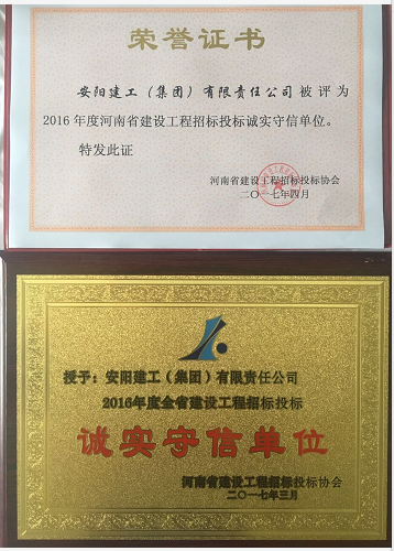 榮獲河南省建設(shè)工程招投標(biāo)協(xié)會(huì)(誠實(shí)守信單位)稱號(hào)