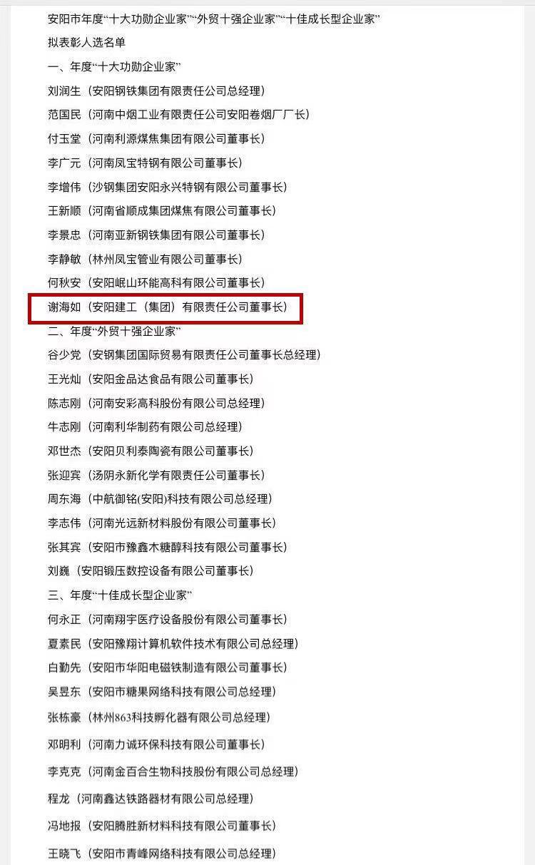 喜訊!集團公司董事長謝海如同志入圍2020年度安陽市“十大功勛企業(yè)家”名單