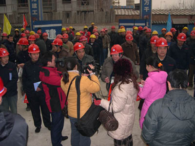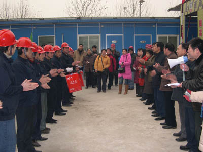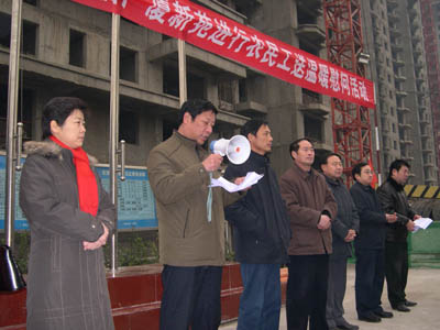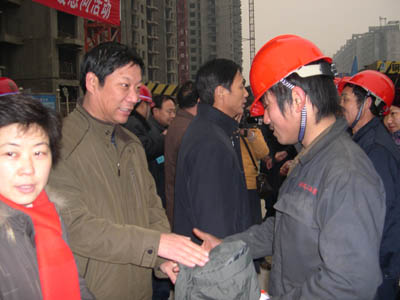 2008年1月10日是一個(gè)普通的日子,但對(duì)于建工(集團(tuán))廣廈工地上的農(nóng)民工來說卻是難忘的一天。這一天天氣格外寒冷,氣溫驟降給建筑工人戶外作業(yè)增加了勞動(dòng)難度和強(qiáng)度。安陽建工(集團(tuán))各建筑工地上的工人師傅們和往常一樣仍堅(jiān)守在各自的工作崗位上,依然認(rèn)真工作、辛勤勞動(dòng)著,他們絲毫沒有因?yàn)橥獠織l件艱苦而影響了工作。安陽市總工會(huì)主席聶孟磊、副主席陰春生、保障部部長(zhǎng)呂啟霞 、城建水利工會(huì)主席陳亮等一行在這一天帶著100件羽絨服、100本《農(nóng)民工知識(shí)讀本》和對(duì)廣大農(nóng)民工的一片關(guān)愛來到了廣廈新苑工地,為那里的農(nóng)民工送去了溫暖。公司領(lǐng)導(dǎo)謝海如、馬松林、鐘新安及市機(jī)關(guān)事務(wù)管理局廣廈新苑指揮部人員參加了這次送溫暖活動(dòng)。公司黨委副書記、工會(huì)主席馬松林主持儀式。