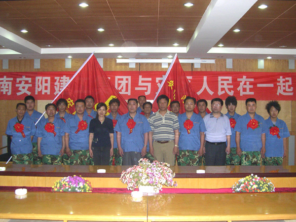 帶著建工人的重托,帶著建工人對災(zāi)區(qū)群眾的深情厚意,5月28日早上7:00,安陽建工集團(tuán)安裝公司15名干部職工組成的第一支抗震救災(zāi)先遣隊伍,在安陽市建委的統(tǒng)一安排下,從安陽集結(jié)出發(fā),奔赴四川綿陽災(zāi)區(qū)援助災(zāi)后重建。歡送儀式在集團(tuán)公司隆重舉行,公司領(lǐng)導(dǎo)及廣大員工為隊員壯行,安裝公司經(jīng)理程運(yùn)保領(lǐng)著胸戴大紅花的突擊隊員走進(jìn)會場時,大家起立鼓掌并向他們致以崇高的敬意!在歡送儀式上,集團(tuán)公司董事長、總經(jīng)理謝海如向先遣隊授旗,公司副總盧麗娜主持歡送儀式。