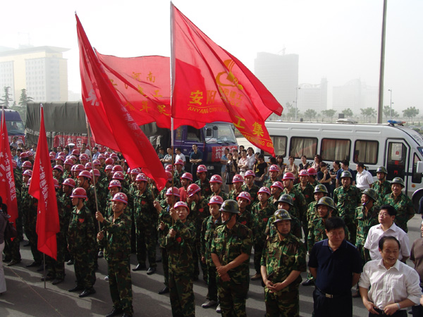 第一支安裝突擊隊隊長、安裝公司副經(jīng)理劉民代表突擊隊表態(tài):“安陽建工與災(zāi)區(qū)人民在一起心連心,堅決服從組織安排,圓滿完成承建任務(wù)?!弊S⑿蹅冊缛談P旋而歸!安全而歸!