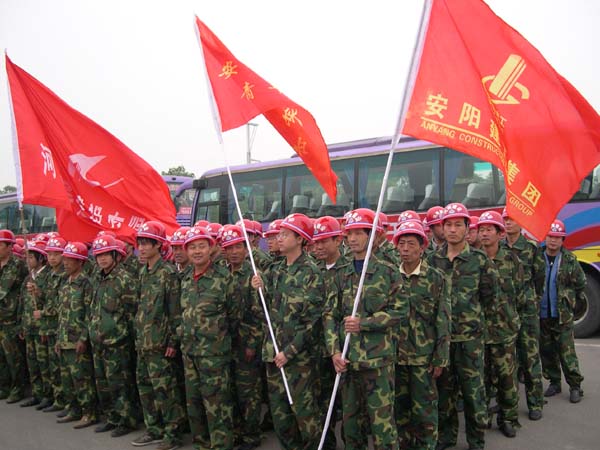 我公司繼5月28日第一批15人和6月2日第二批5人奔赴四川災(zāi)區(qū)之后,昨天,第三批援建四川災(zāi)區(qū)活動(dòng)板房突擊隊(duì)啟程赴川,這樣三批突擊隊(duì)員加上先前赴災(zāi)區(qū)的公司副總經(jīng)理劉艷軍和項(xiàng)目經(jīng)理原伏生,我公司赴災(zāi)區(qū)援建人數(shù)已達(dá)35人。