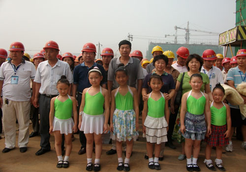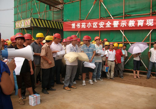 7月15日上午,安陽(yáng)市總工會(huì)副主席宋忠平、保障部部長(zhǎng)呂啟霞、城建水利工會(huì)副主席董江紅一行,來(lái)到我公司承建的如火如荼的博書(shū)苑工地,看望在高溫時(shí)節(jié)奮戰(zhàn)在施工一線的建筑工人,并為他們送去了毛巾、風(fēng)油精、汗衫、《農(nóng)民工知識(shí)讀本》等防暑降溫慰問(wèn)品,市總工會(huì)給工地帶來(lái)了關(guān)懷帶來(lái)了愛(ài),同時(shí)也為工地帶來(lái)了歡快活潑的少兒舞蹈“愛(ài)的人間”,小朋友們用稚嫩的聲音深情地說(shuō):工人叔叔辛苦了!她們的熱情感染了在場(chǎng)的每個(gè)人。宋主席一邊給工人送上慰問(wèn)品,一邊關(guān)切地詢問(wèn)他們的工作、生活情況,囑咐要注意身體健康、防暑降溫。他說(shuō):“博書(shū)苑是安陽(yáng)市最大的經(jīng)濟(jì)適用房,一直受到市各級(jí)領(lǐng)導(dǎo)的關(guān)注,你們冒著酷暑仍然堅(jiān)守在工作崗位上,辛苦了,我向你們表示感謝?!彼诠さ匾侠戆才殴て谟?jì)劃,一定要讓工人注意合理休息。公司副總經(jīng)理郝志峰、工會(huì)主席馬松林到現(xiàn)場(chǎng)參加了活動(dòng),郝經(jīng)理表示:我們要更加努力的工作,克服高溫酷暑,全力投入生產(chǎn),以實(shí)際行動(dòng)感謝市工會(huì)的關(guān)心支持!面對(duì)還將持續(xù)下去的高溫天氣,我們要繼續(xù)發(fā)揚(yáng)艱苦奮斗、無(wú)私奉獻(xiàn)的精神,堅(jiān)守工作崗位,安全生產(chǎn),安全度夏。